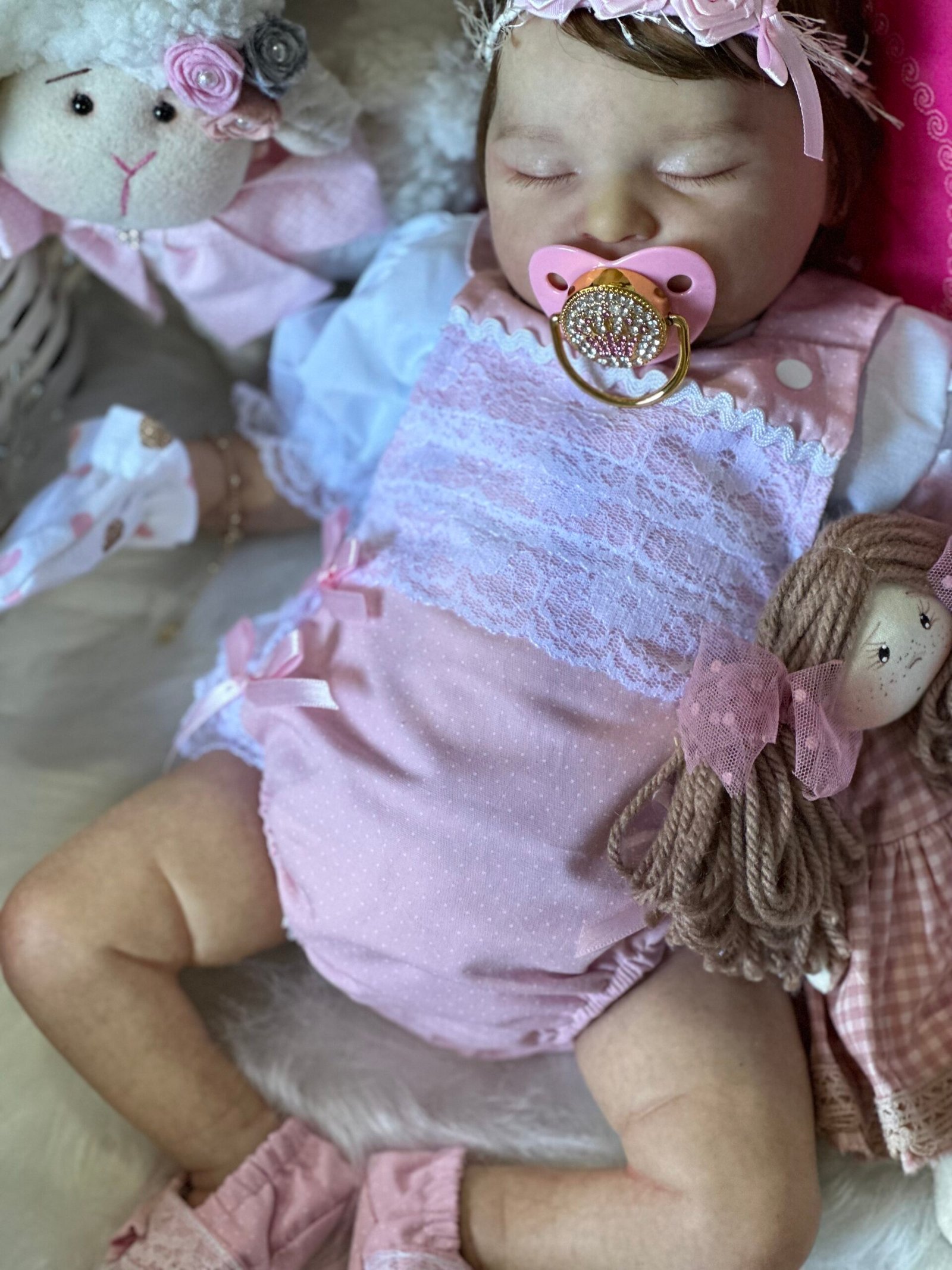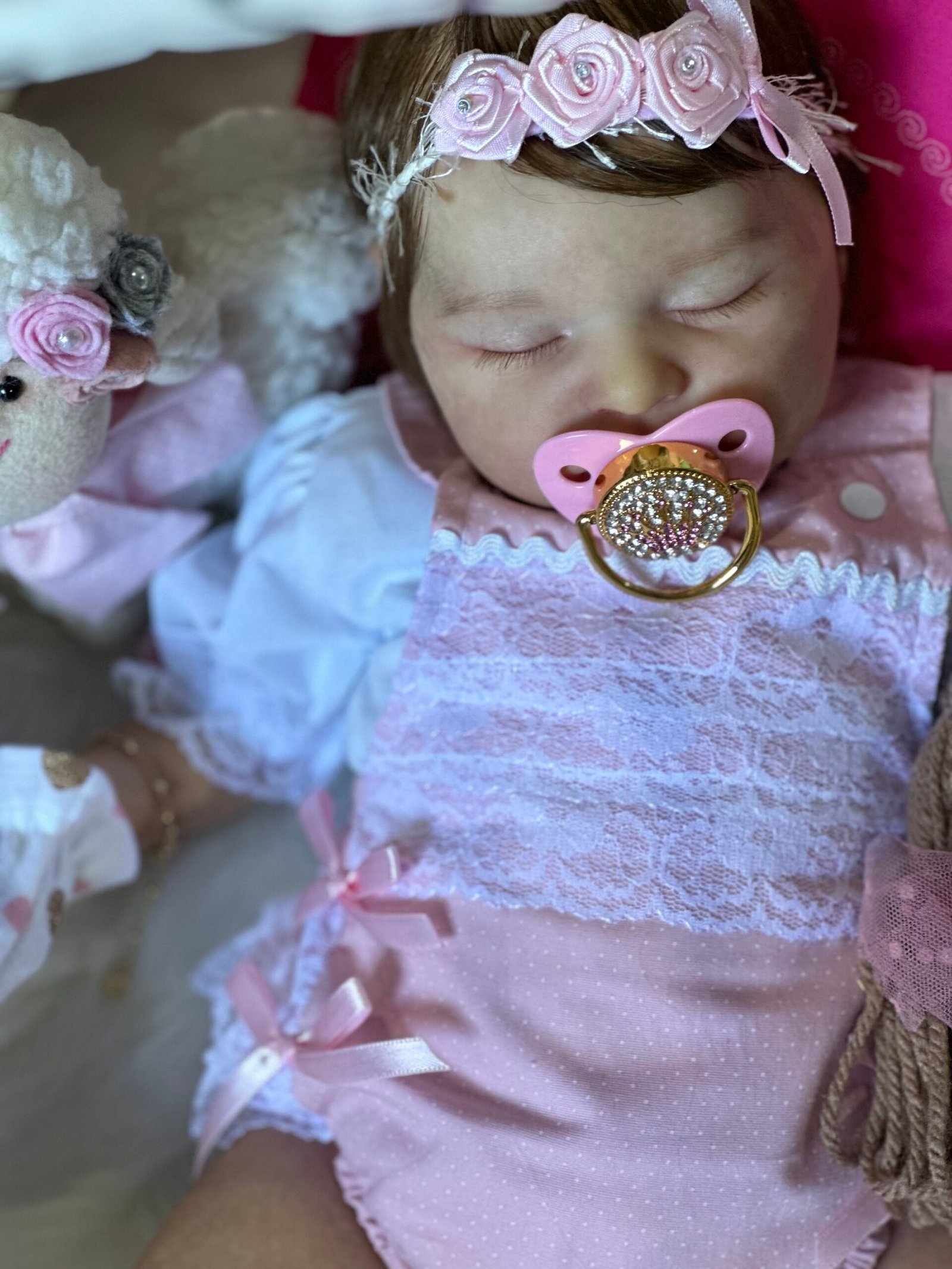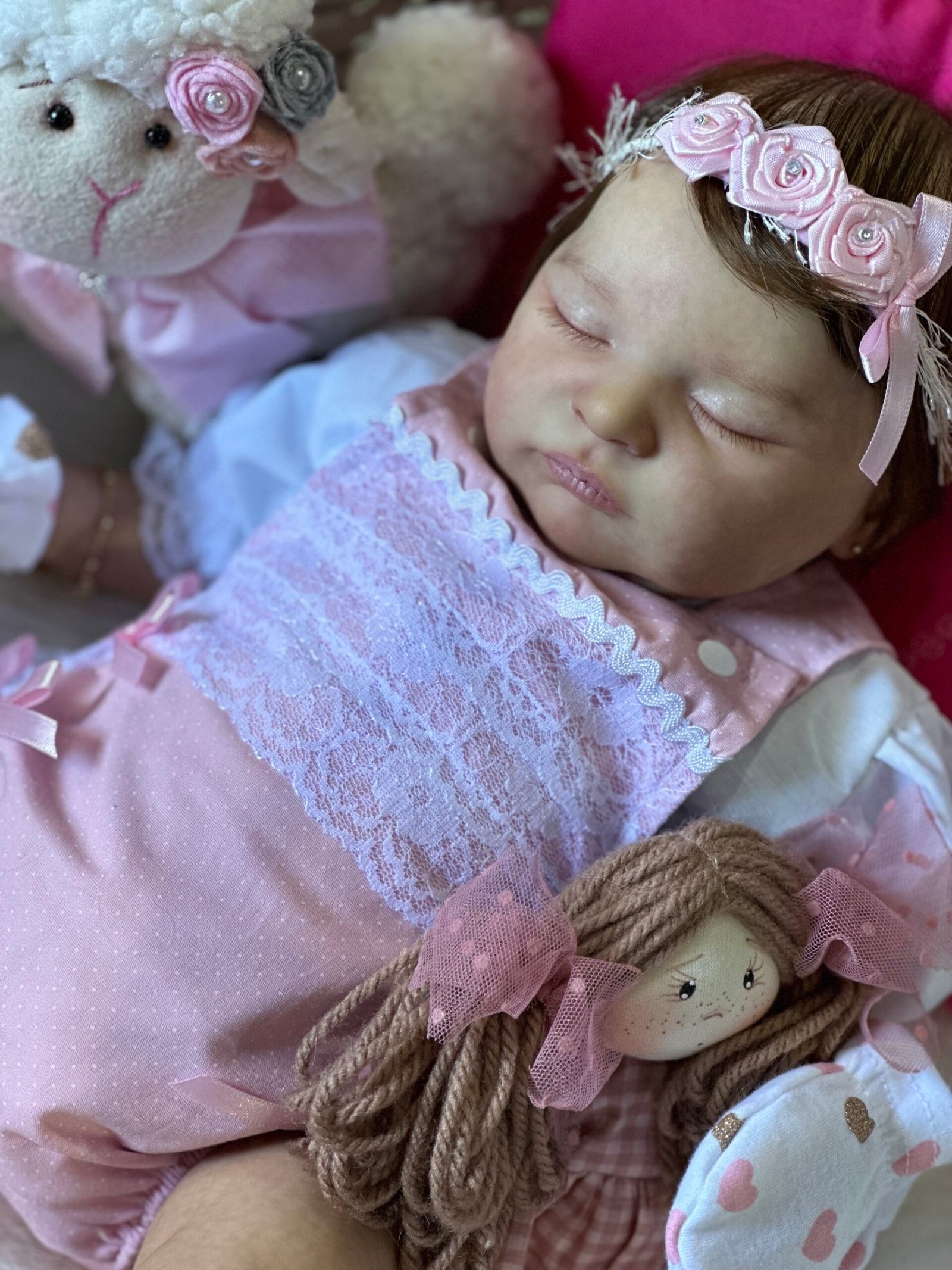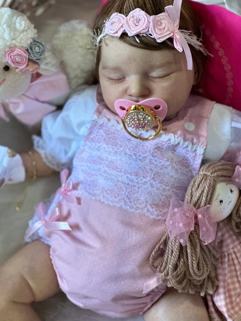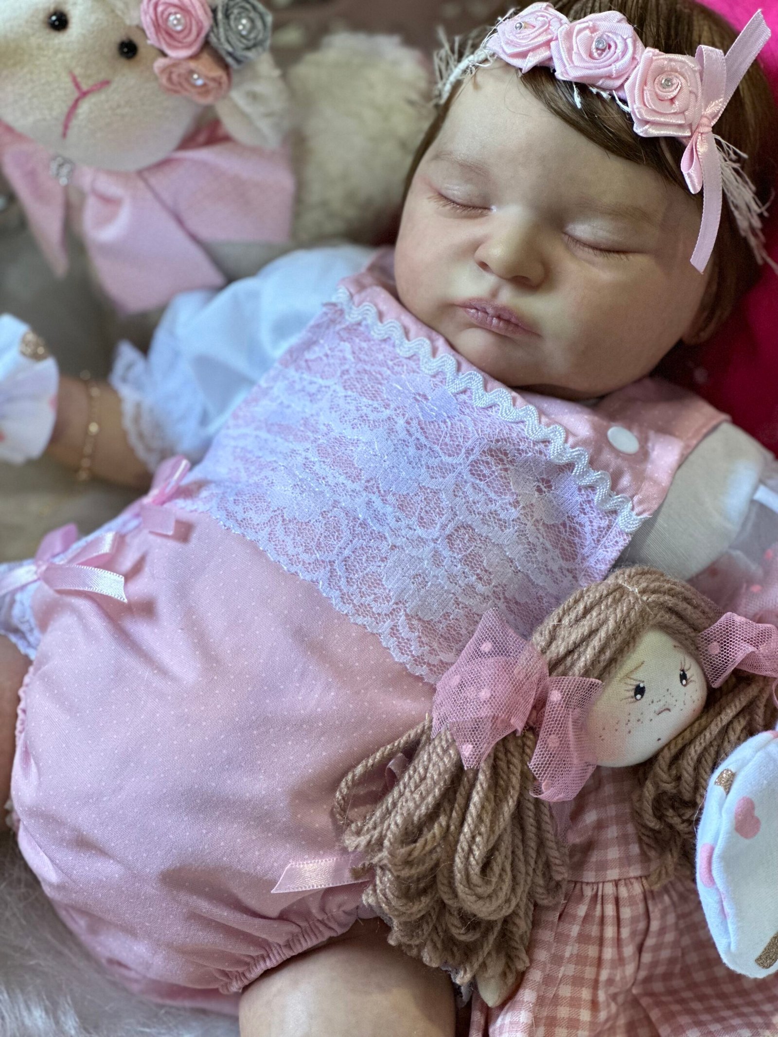 Pintada a mão com tinta importada e cabelinho enraizado fio por fio com fibra beautex e olhos fechados.