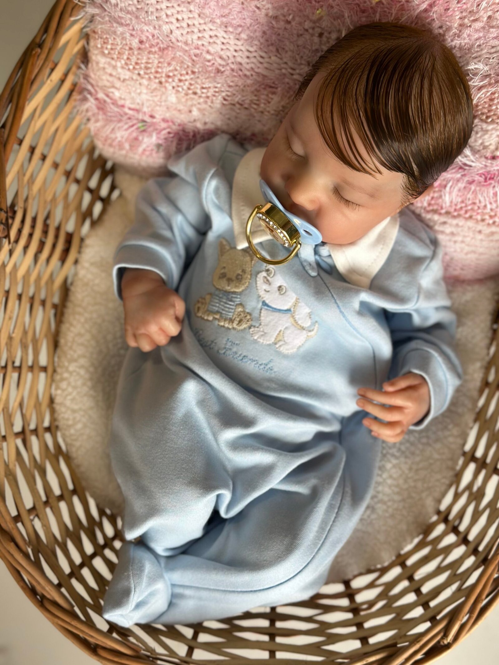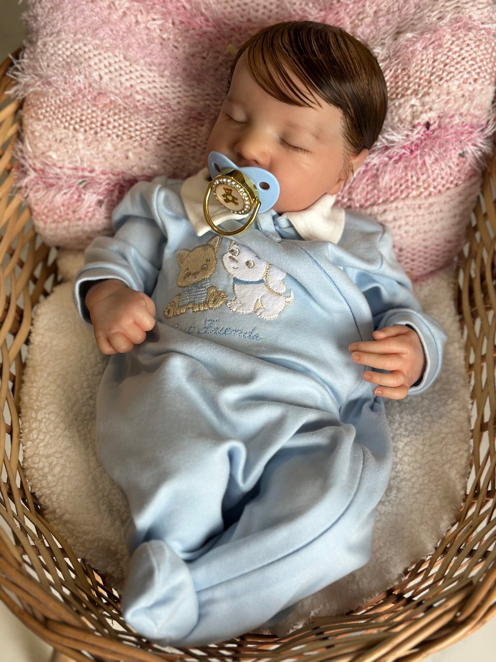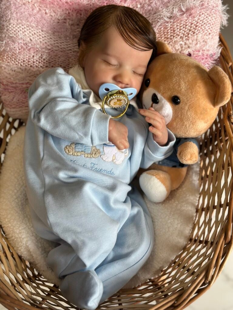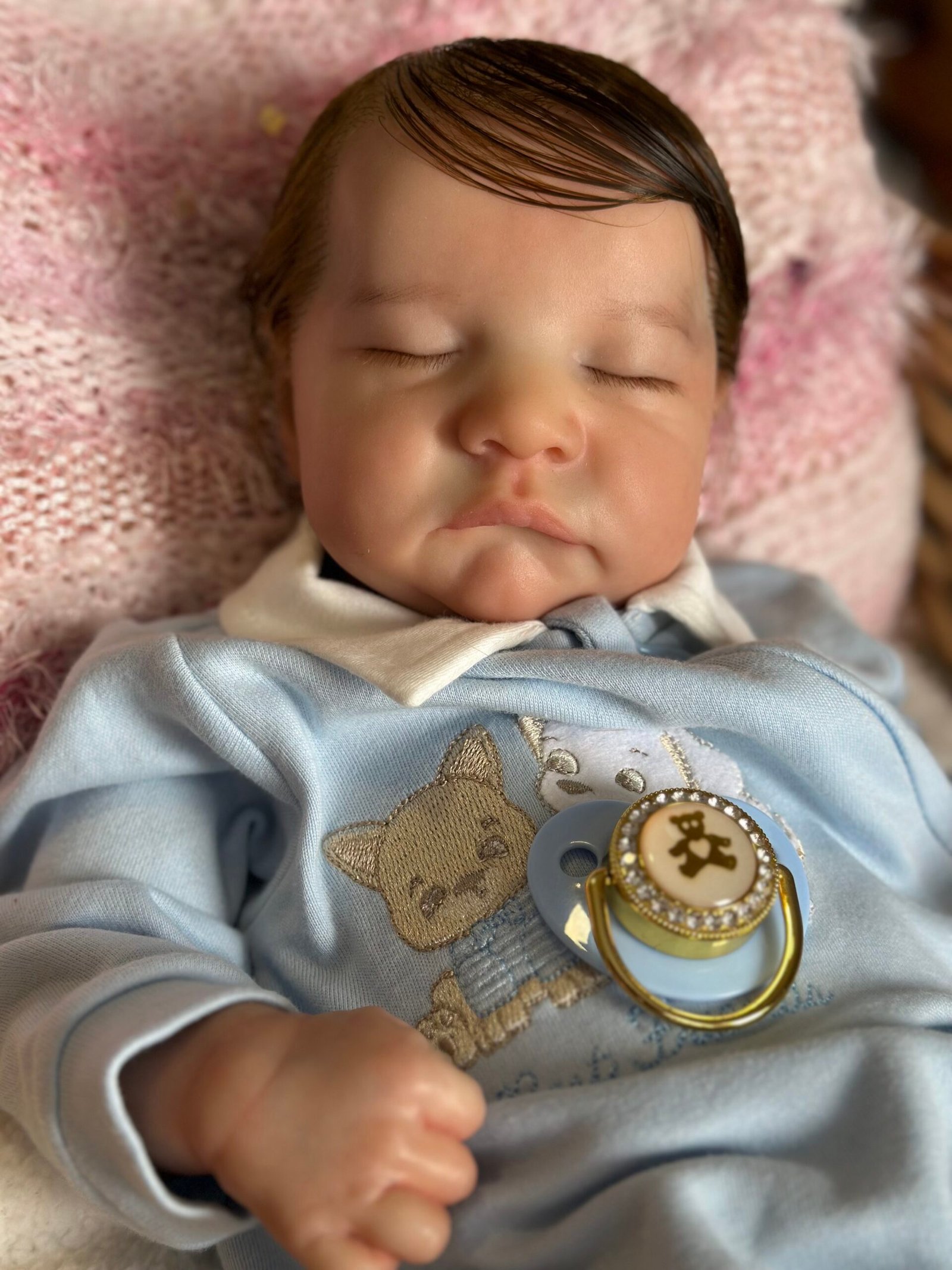 Pintada a mão com tinta importada e cabelinho enraizado fio por fio com fibra beautex e olhos fechados.