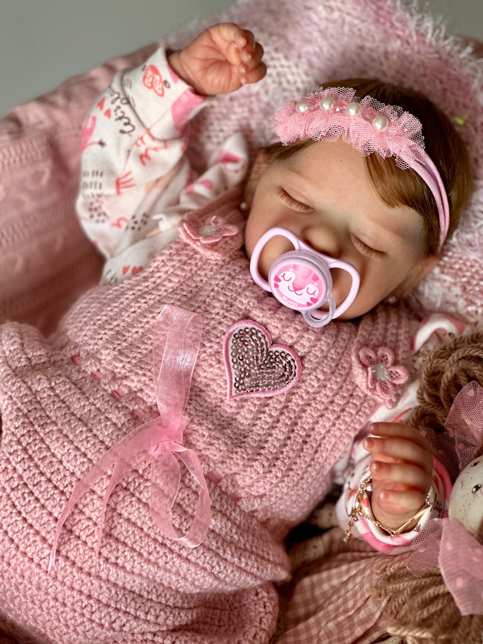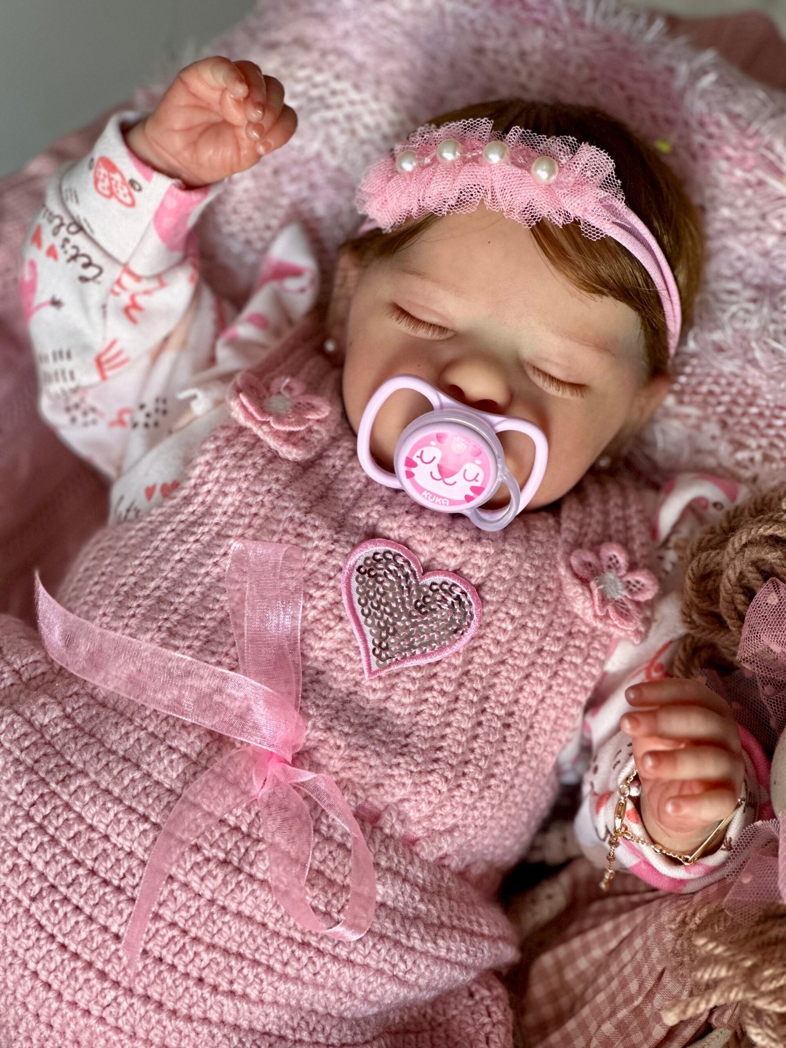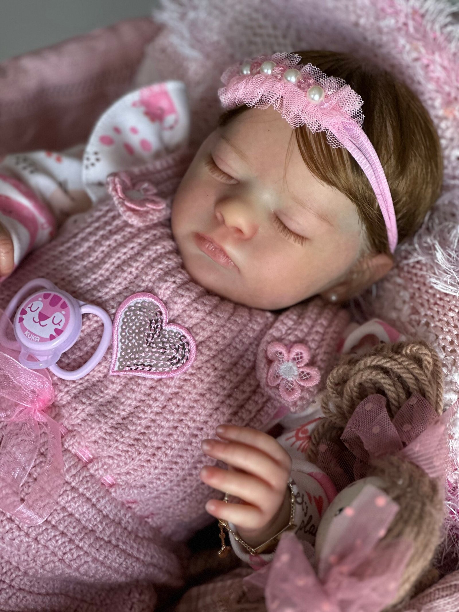 Pintada a mão com tinta importada e cabelinho enraizado fio por fio com fibra beautex e olhos fechados.