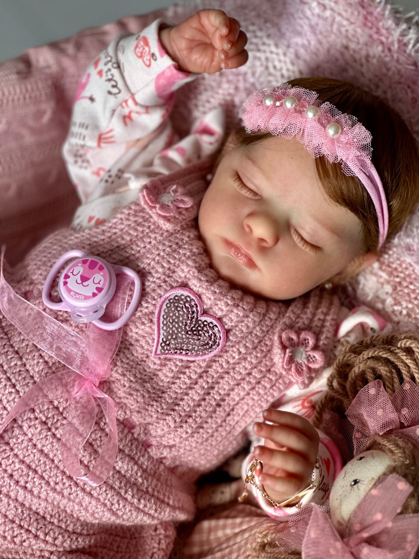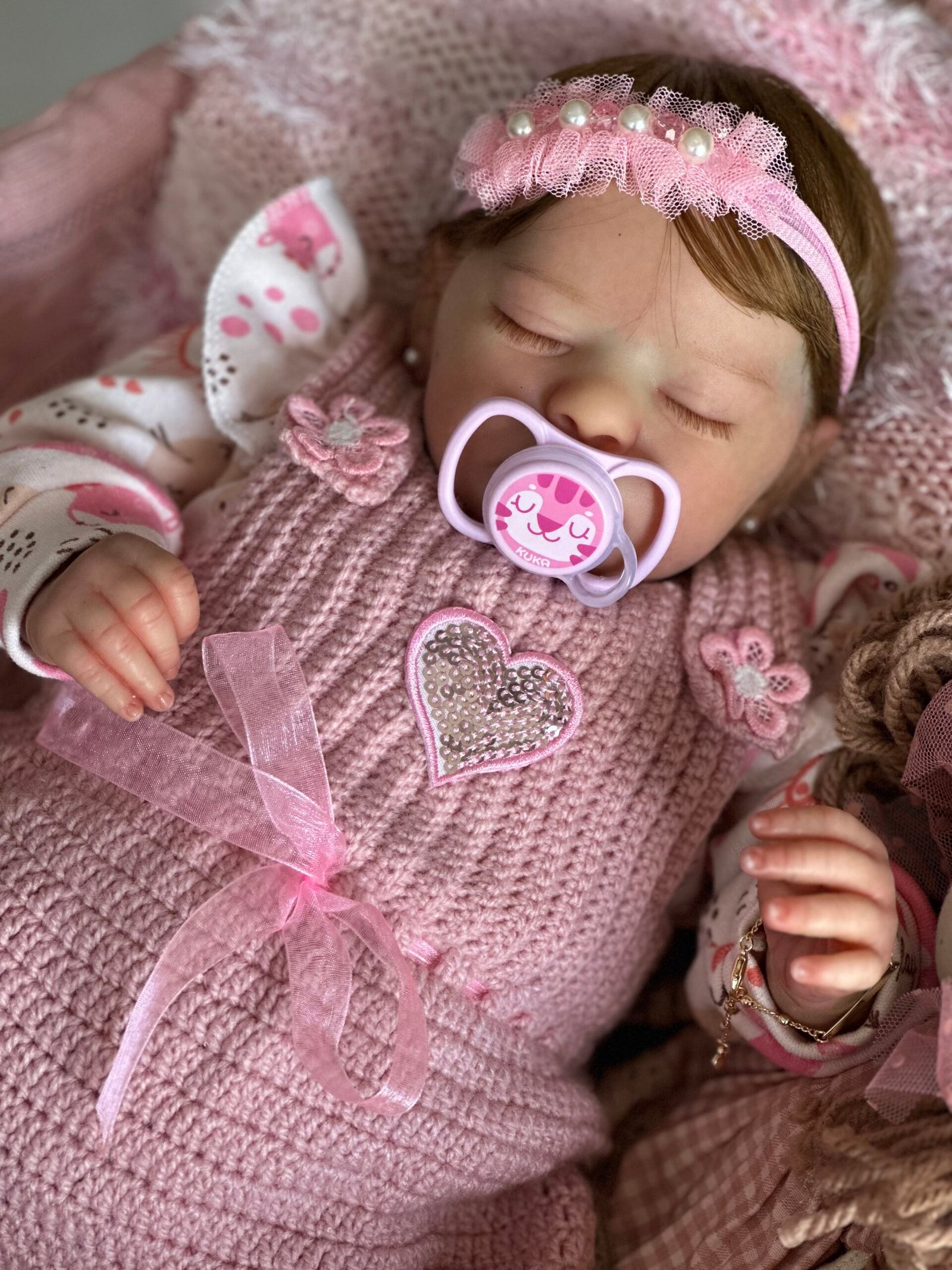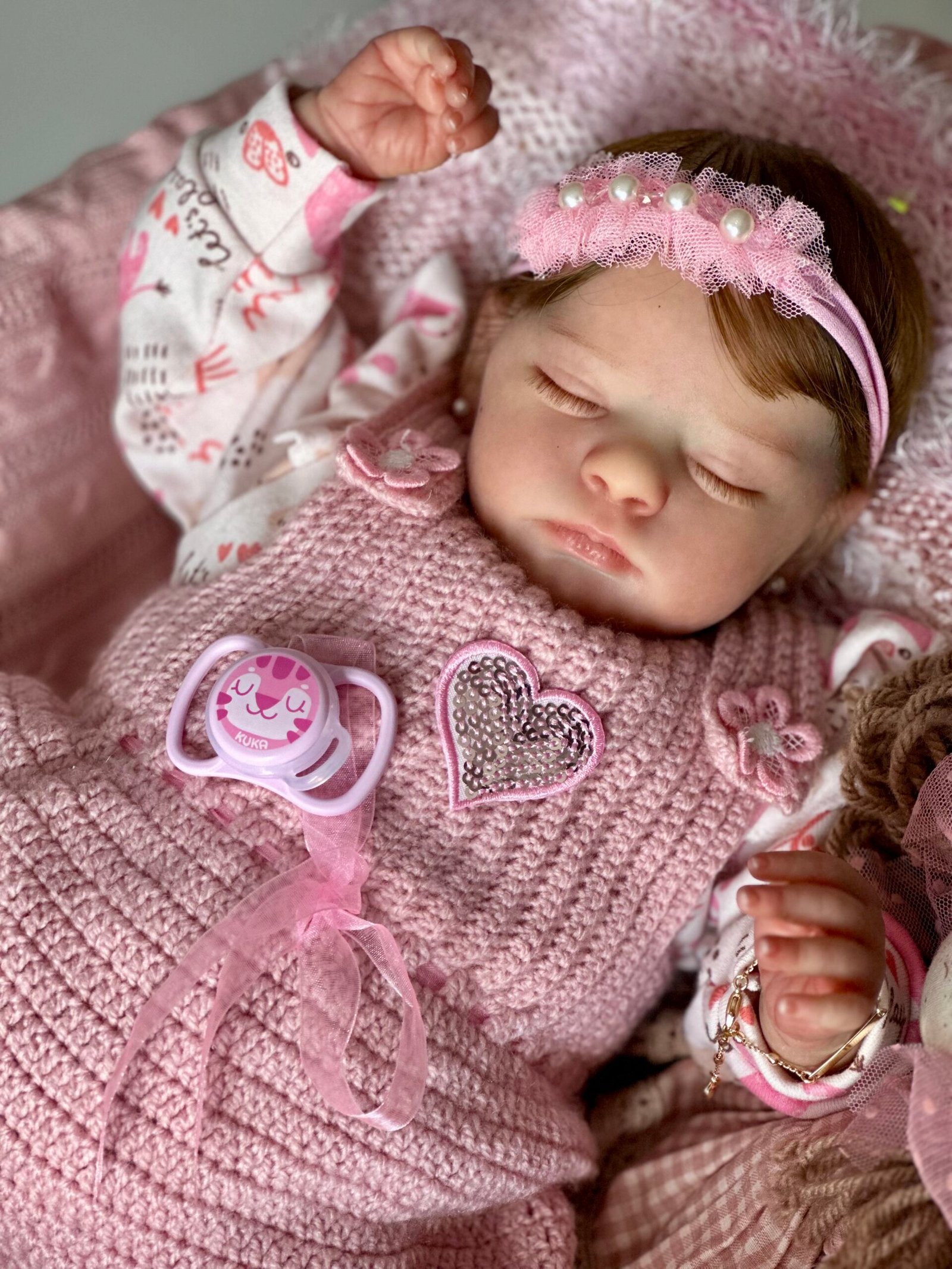 Pintada a mão com tinta importada e cabelinho enraizado fio por fio com fibra beautex e olhos fechados.