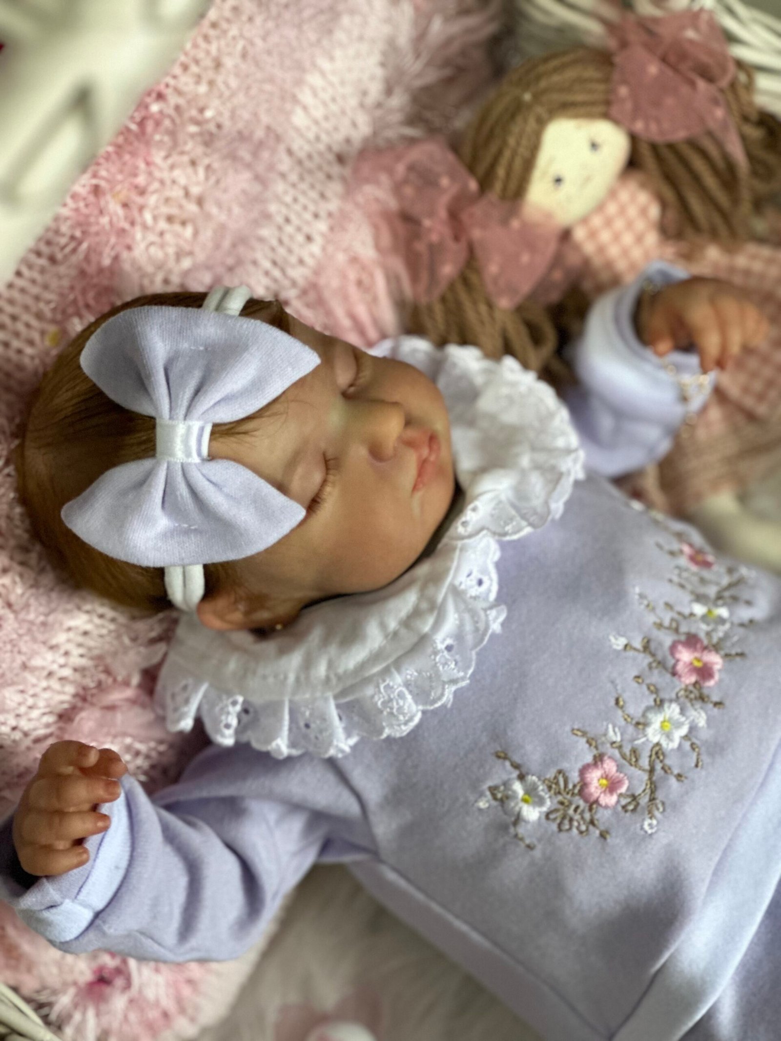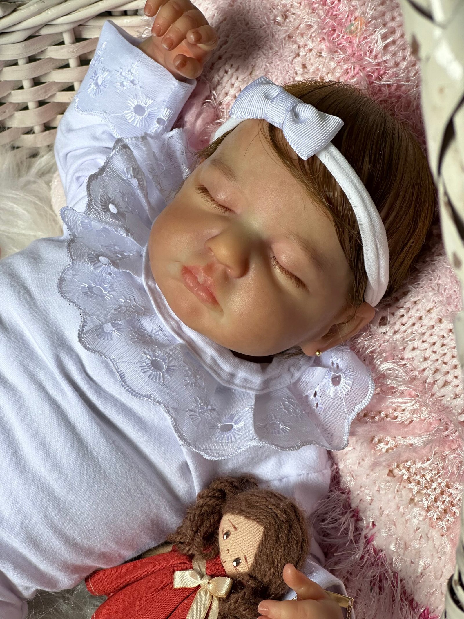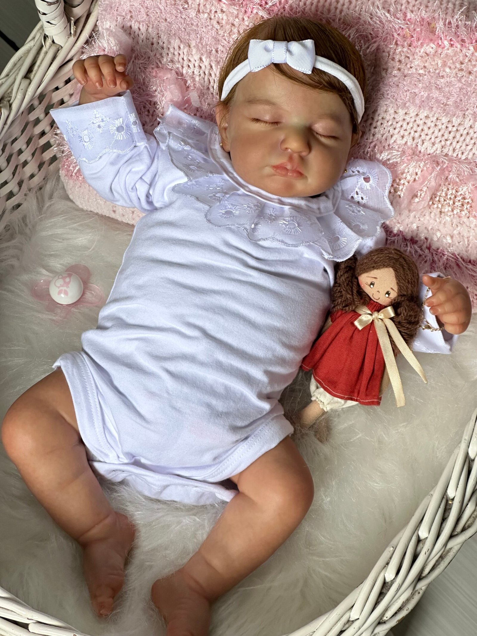 Pintada a mão com tinta importada e cabelinho enraizado fio por fio com fibra beautex e olhos fechados.
