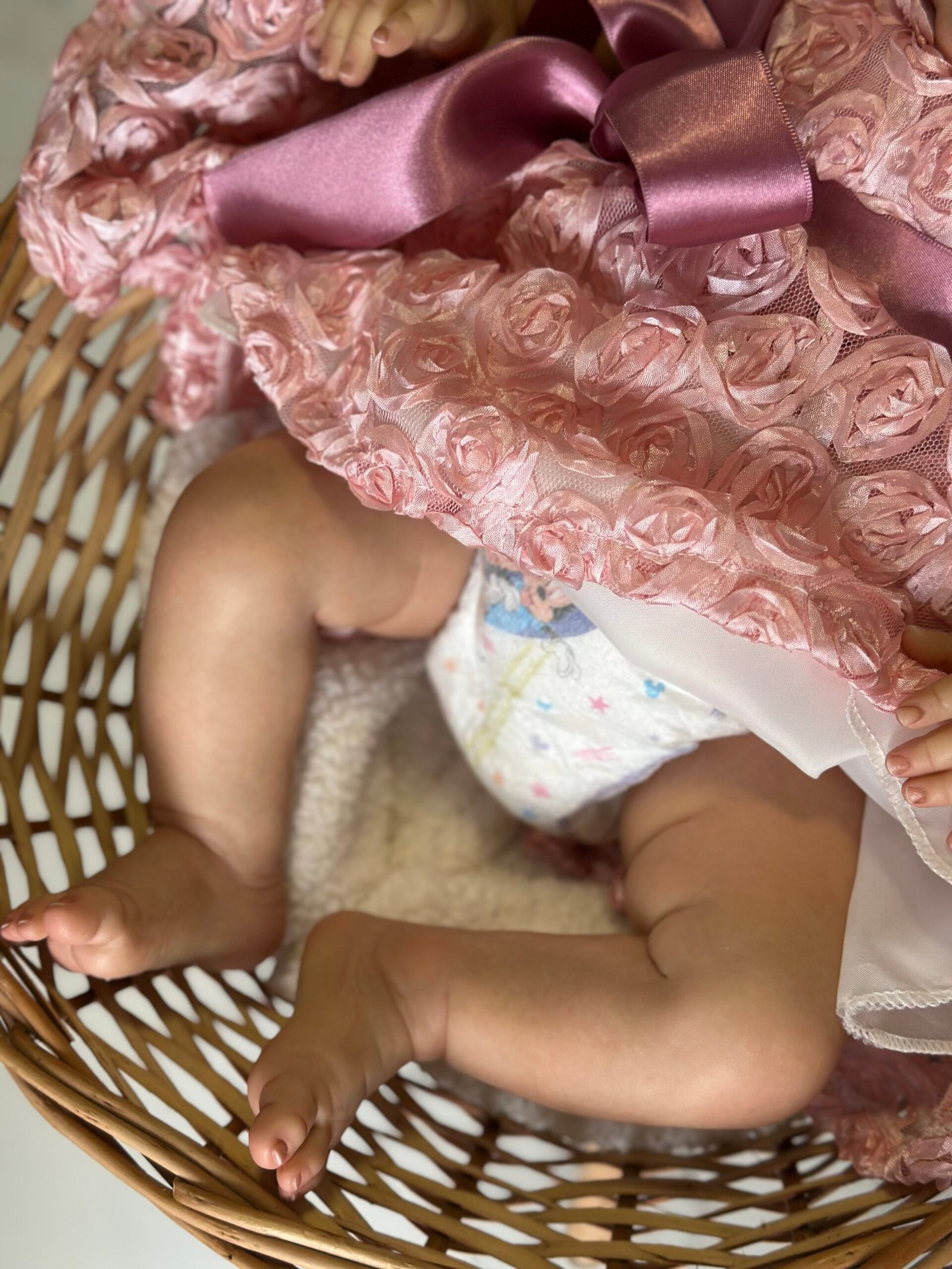 -Roupa da foto com brinco, fralda, meia e body na bebê;