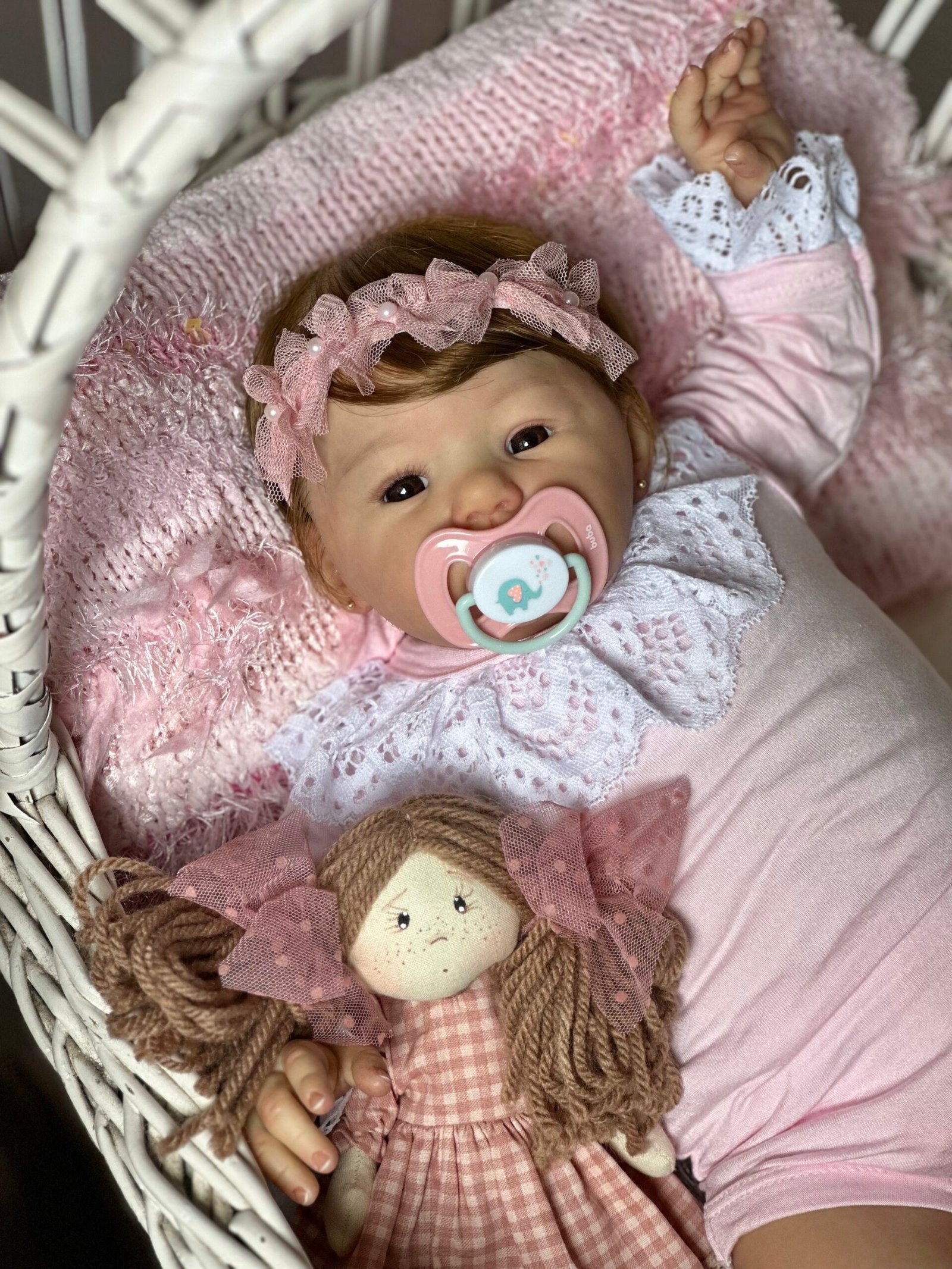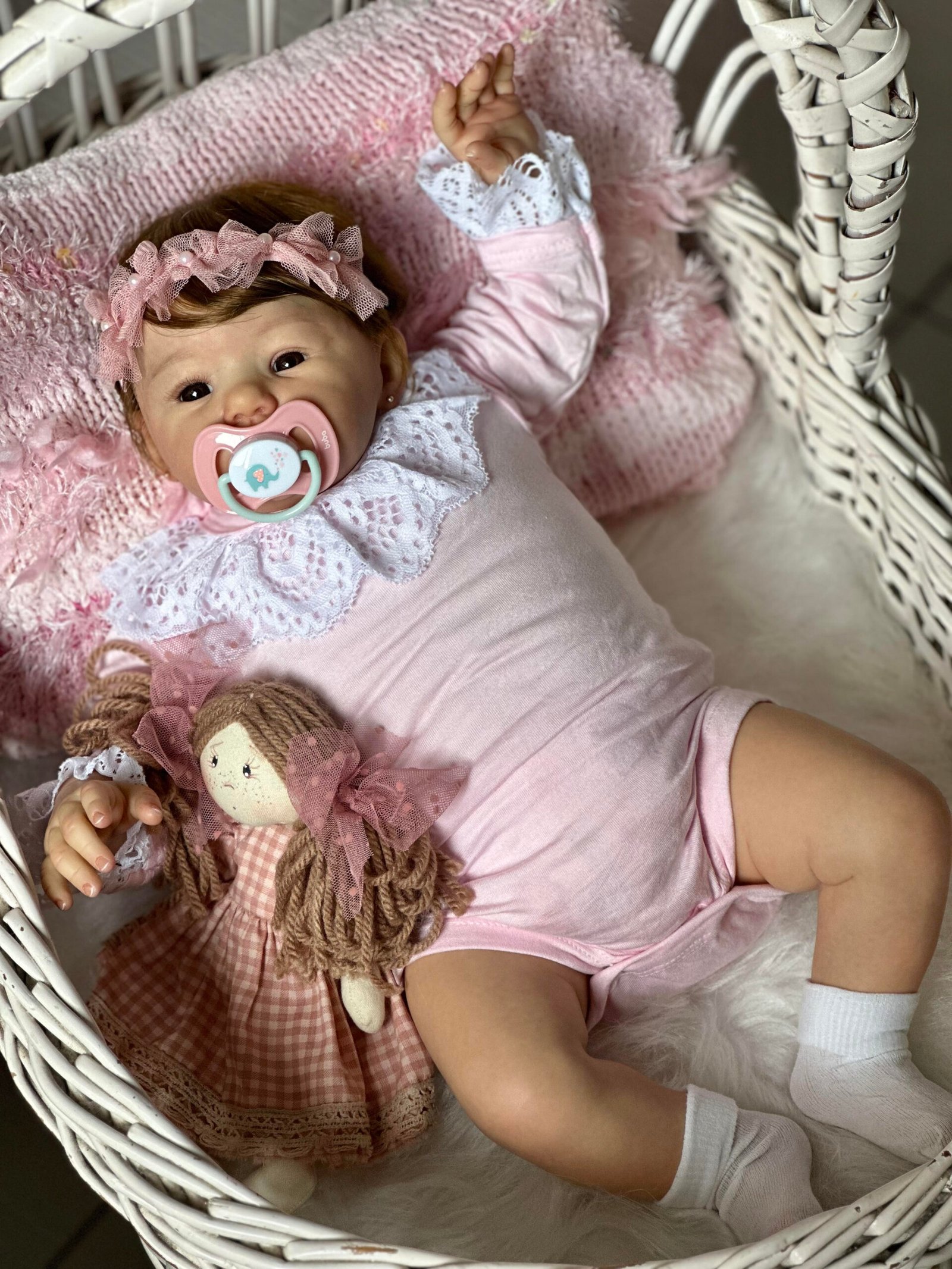 Pintada a mão com tinta importada e cabelinho enraizado fio por fio com fibra beautex e olhinhos castanho realista.